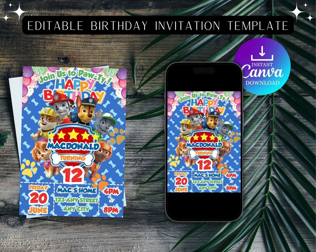 Editable Paw Patrol Birthday Invitation Template, Paw-ty Patrol Kids Birthday Party, Digital Kids Party Invite, Instant Evite Bday Card